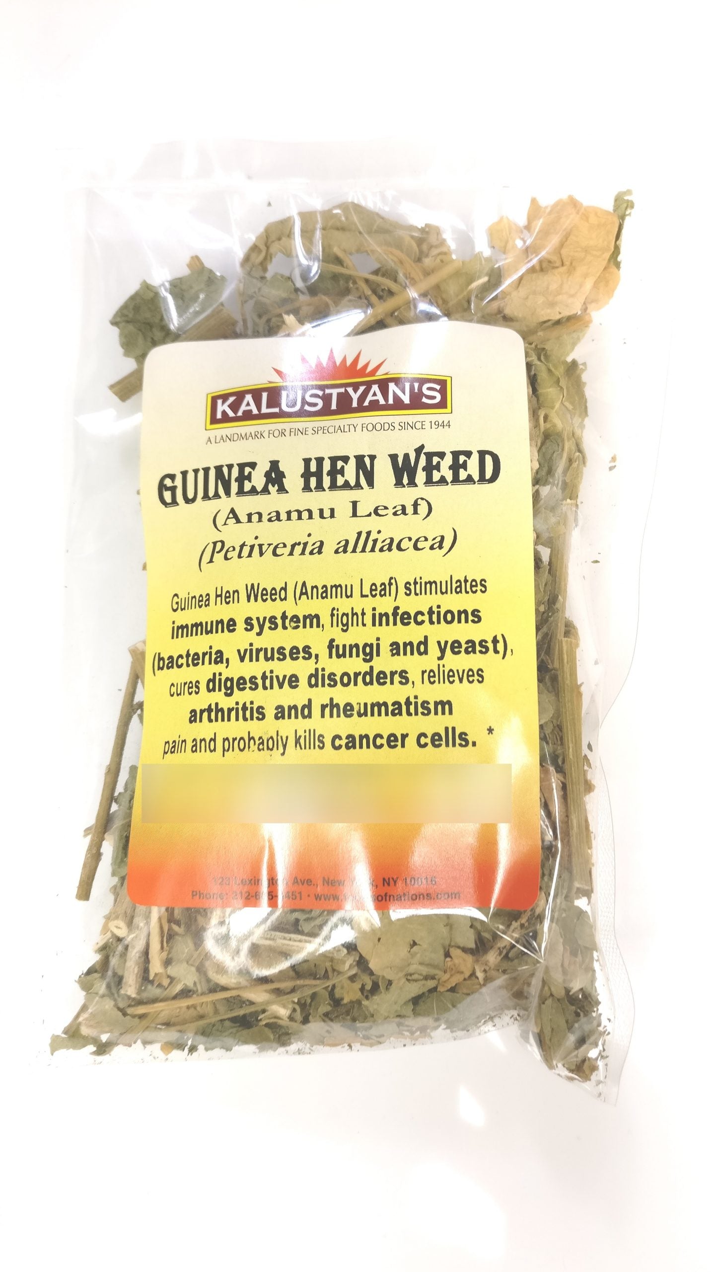 Guinea Hen Weed (Anamu Leaf) stimulates immune system, fight infections (bacteria, viruses, fungi and yeast), cures digestive disorders, relieves arthritis and rheumatism pain and probably kills cancer cells. *